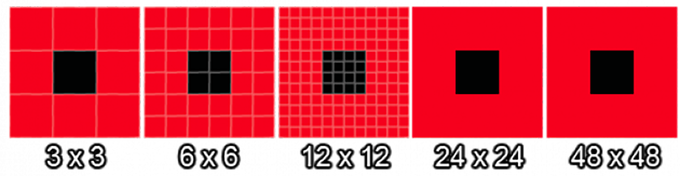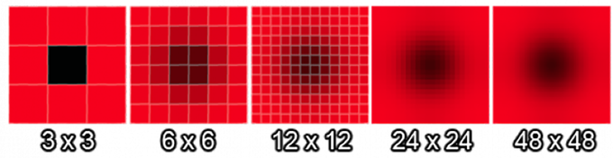 Voici trois exemples de rééchantillonnage dans lesquels nous allons partir d'une image de 3 x 3 pixels contenant un pixel noir entouré de 8 pixels rouge. Nous allons doubler le nombre de pixels de cette image à chaque étape (ce qui revient à la rééchantillonner) en utilisant différentes interpolation pour voir ce que cela peut donner.