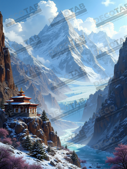 Ce tableau met en scène un décor spectaculaire : une chaîne himalayenne majestueuse s’élève dans toute sa verticalité, occupant la quasi-totalité de la composition. À sa base, presque imperceptible au premier regard, se dresse un temple bouddhiste tibétain, modeste, isolé, et pourtant chargé de présence. Ce contraste d’échelle entre l’immensité minérale et la finesse de la construction humaine capte l’attention et invite à la réflexion.