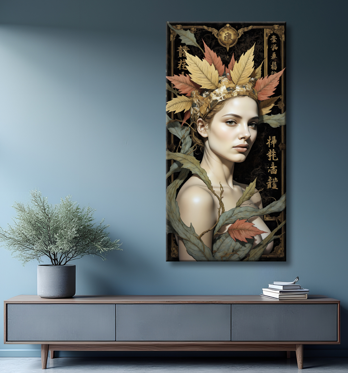 Ce tableau imprimé en art numérique dévoile un portrait féminin empreint d’une douceur mystérieuse, où la figure féminine se fond harmonieusement avec des éléments végétaux tels que des feuilles et des branches délicates. Évoquant une égérie ou un esprit protecteur de la nature, ce portrait se distingue par son ambiance subtilement mystique et sa beauté éthérée.