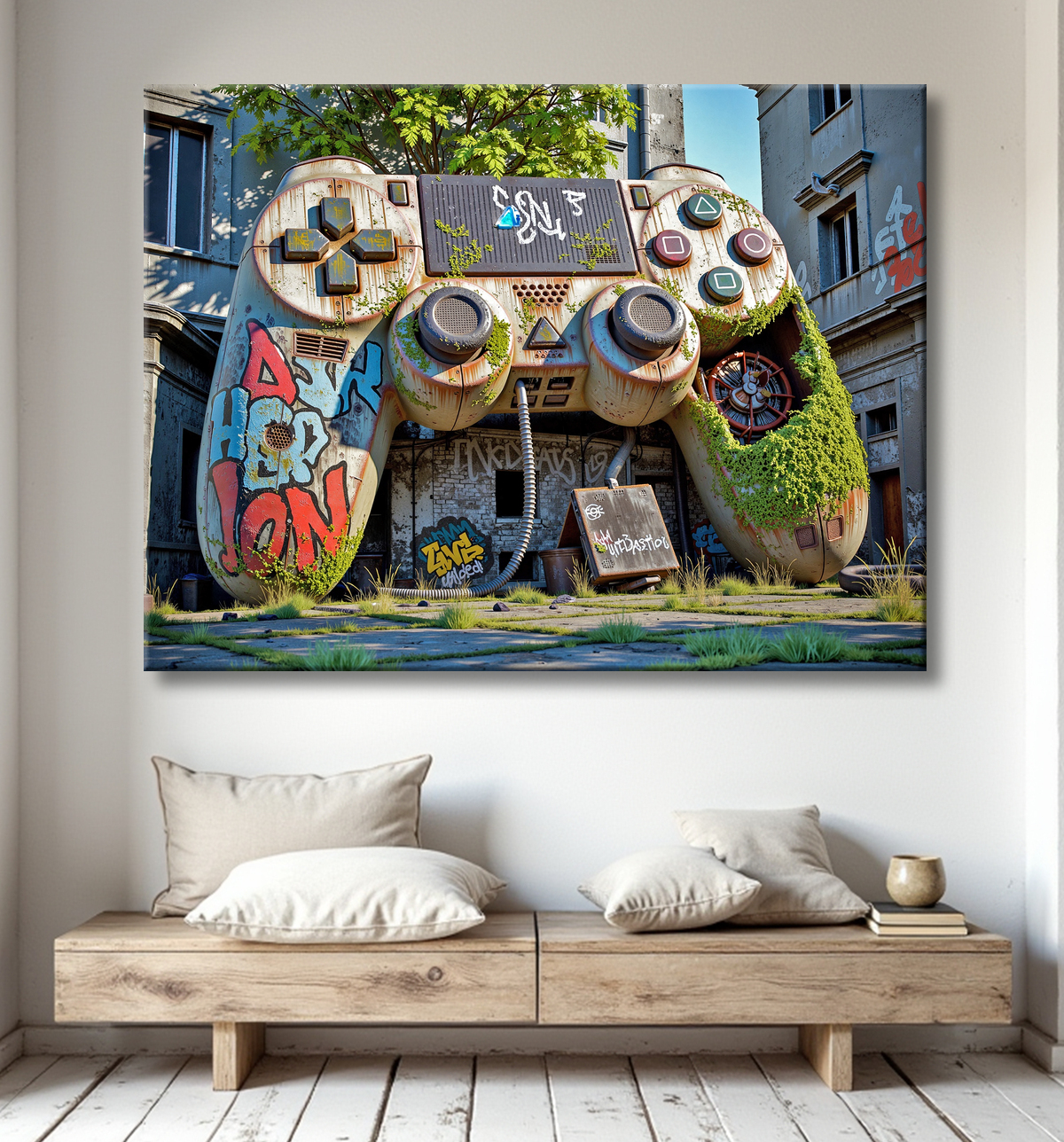 Le tableau manette urbaine de DECOTAB propose une vision saisissante du temps suspendu. Une gigantesque manette de jeux vidéo, usée et rouillée, repose entre des immeubles de deux à trois étages, évoquant une ère révolue. Couverte de mousse, taguée de graffitis colorés, sa coque fracturée témoigne de l'abandon et du passage du temps. Cette œuvre puissante mêle art gaming et inspirations urbaines dans une ambiance post-apocalyptique. Découvrez également une autre interprétation dans notre tableau manette échouée sur plage.