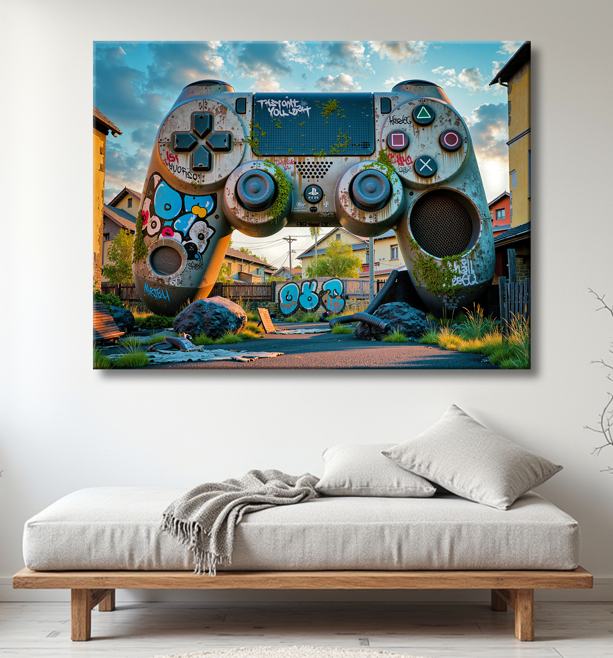 Le tableau manette urbaine de DECOTAB propose une vision saisissante du temps suspendu. Une gigantesque manette de jeux vidéo, usée et rouillée, repose entre des immeubles de deux à trois étages, évoquant une ère révolue. Couverte de mousse, taguée de graffitis colorés, sa coque fracturée témoigne de l'abandon et du passage du temps. Cette œuvre puissante mêle art gaming et inspirations urbaines dans une ambiance post-apocalyptique. Découvrez également une autre interprétation dans notre tableau manette échouée sur plage.