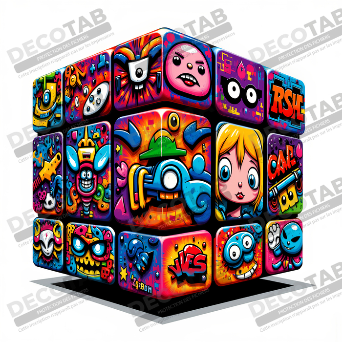 Plusieurs versions de cette œuvre sont disponibles sur le site, jouant avec des fonds variés, des palettes différentes et des arrangements de motifs toujours renouvelés. Chaque variante conserve le Rubik's Cube comme élément central, mais s’exprime dans une ambiance visuelle unique. Idéal pour composer un décor pop, coloré et original.
