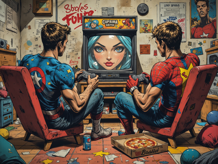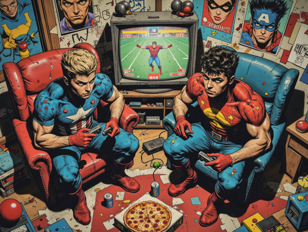 Ce tableau ultra stylé plonge au cœur d'une chambre de gamers en mode chaos total. Deux joueurs habillés de vêtements inspirés des super-héros, illustrés eux-mêmes comme des personnages de jeux vidéo, sont totalement absorbés, voire lobotomisés, par leur écran. Au sol, des cannettes de soda, des restes de pizza, et des meubles vintage complètement usés complètent cette scène digne d'un pur décor geek.