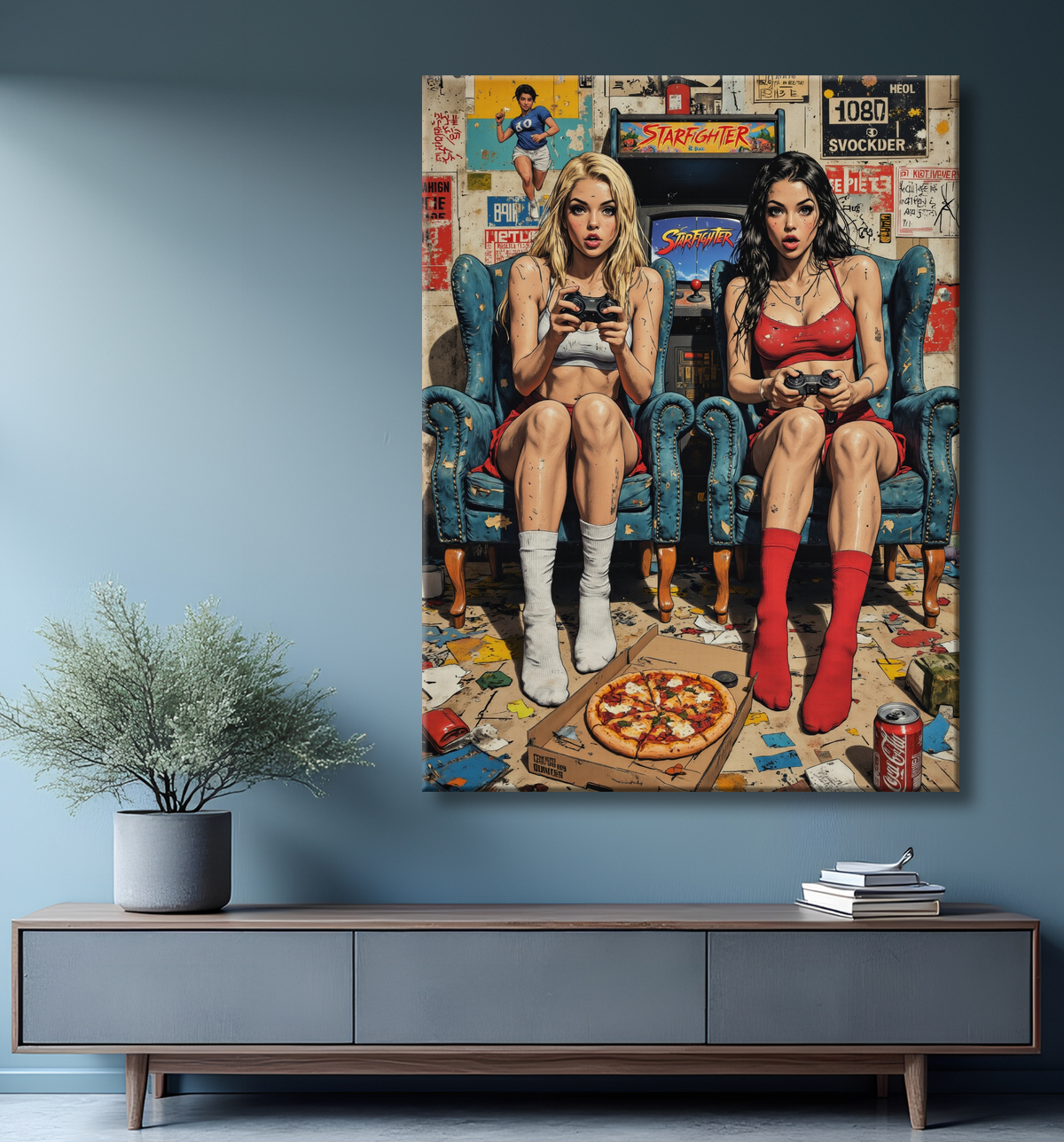 Ce tableau percutant met en scène deux filles gameuses à l'attitude sexy et provocante, totalement immergées dans leur partie de jeu vidéo. Vêtues de tenues inspirées des héroïnes de comics et jeux vidéo, elles évoluent dans un univers geek absolument chaotique : canettes renversées, restes de pizza, meubles vintage abîmés, tout contribue à une atmosphère délirante de gaming.