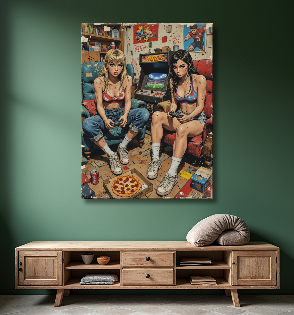 Ce tableau percutant met en scène deux filles gameuses à l'attitude sexy et provocante, totalement immergées dans leur partie de jeu vidéo. Vêtues de tenues inspirées des héroïnes de comics et jeux vidéo, elles évoluent dans un univers geek absolument chaotique : canettes renversées, restes de pizza, meubles vintage abîmés, tout contribue à une atmosphère délirante de gaming.