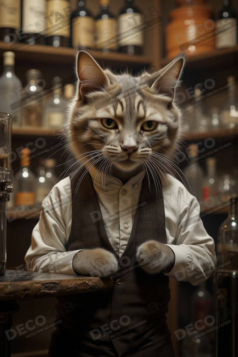 Ce tableau unique représente un chat anthropomorphe élégamment habillé dans un costume vintage soigneusement choisi. Avec une attitude distinguée, l'animal tient un rôle de gentleman ou de dandy, évoquant l'atmosphère raffinée et décontractée des salons d'époque. Le décor, composé de meubles anciens, de cadres dorés et d'accessoires rétro, accentue encore l'ambiance chaleureuse et pleine de charme du tableau.