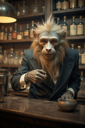 Ce tableau met en scène un hippopotame anthropomorphique, vêtu d'une tenue rétro, derrière le comptoir d'un bar vintage. Avec son sourire accueillant et son attitude décontractée, l'hippopotame incarne un serveur charismatique. En arrière-plan, des étagères remplies de bouteilles anciennes et de verres scintillants ajoutent une touche d'authenticité à cette scène pleine de caractère.