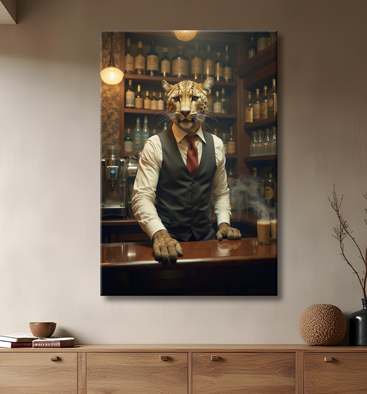 Le tableau léopard serveur vintage capture avec brio l’allure naturelle du léopard, transposée dans une ambiance de bar rétro. Vêtu d’un élégant costume trois pièces, coiffé d’un léger sourire malicieux, le léopard s’inscrit dans un décor de boiseries anciennes, de banquettes en cuir capitonné et de luminaires en laiton patiné. Ce style anthropomorphe singulier, où le raffinement flirte avec la fantaisie, rejoint parfaitement notre collection hypnotique pour les amateurs d’œuvres pleines de caractère et d’originalité.