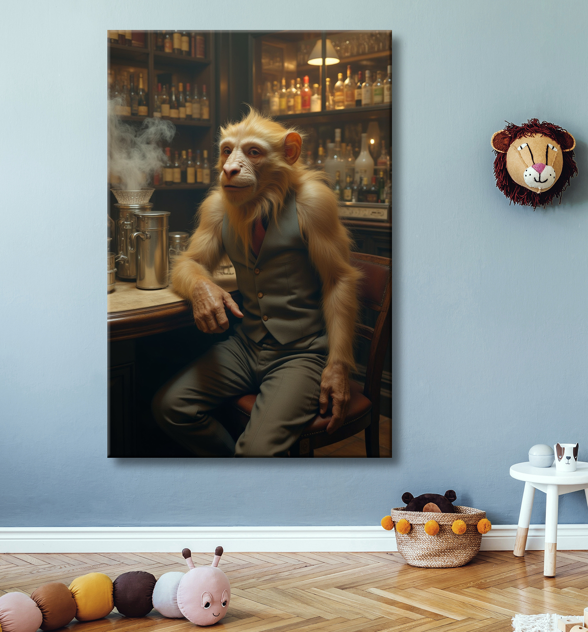 Ce tableau original présente un singe anthropomorphe vêtu élégamment d'une tenue de serveur vintage. Placé derrière un comptoir ancien, il arbore une posture digne et attentive, évoquant parfaitement l'ambiance rétro des bars d'autrefois. Le décor, constitué de verres anciens et de bouteilles vintage, renforce l'aspect authentique et unique de l'œuvre.