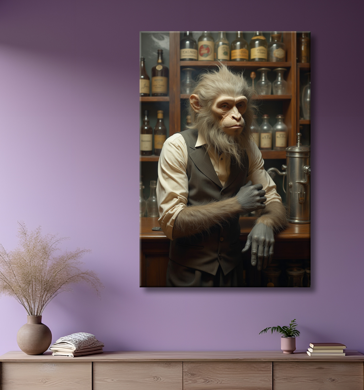 Ce tableau original présente un singe anthropomorphe vêtu élégamment d'une tenue de serveur vintage. Placé derrière un comptoir ancien, il arbore une posture digne et attentive, évoquant parfaitement l'ambiance rétro des bars d'autrefois. Le décor, constitué de verres anciens et de bouteilles vintage, renforce l'aspect authentique et unique de l'œuvre.
