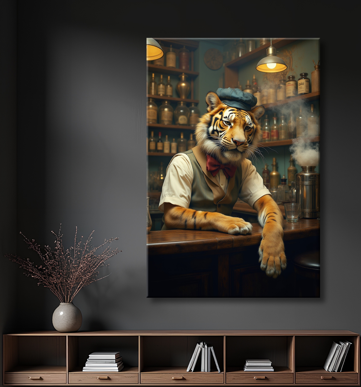 Ce tableau tigre serveur vintage revisite avec panache l’image du fauve légendaire. Paré d'un élégant costume cintré et d'un tablier de serveur raffiné, le tigre est mis en scène dans un bar rétro à l’ambiance feutrée. Entouré de murs en briques patinées, de fauteuils en cuir vieilli et de luminaires en cuivre, il incarne à la perfection l’équilibre entre sauvagerie maîtrisée et distinction urbaine. Ce style anthropomorphe original, vibrant et expressif s’inscrit dans notre collection hypnotique dédiée aux animaux réinventés.