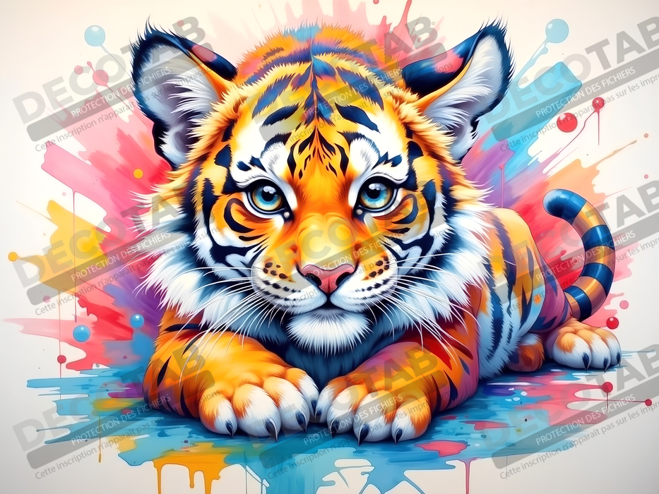 Décliné en plusieurs versions, ce portrait de tigre s’adapte à toutes les ambiances : certaines illustrations mettent en avant une expression contemplative ou douce, d’autres capturent un tigre drôle, excentrique, voire menaçant. Des déclinaisons pastel viennent adoucir les plus exubérantes, tandis que certaines versions intègrent des éclaboussures ou coulures pour accentuer le caractère spontané et artistique de l’image. Ce tableau s'intègre aussi bien dans une déco street art, qu’en touche vive dans un intérieur sobre.