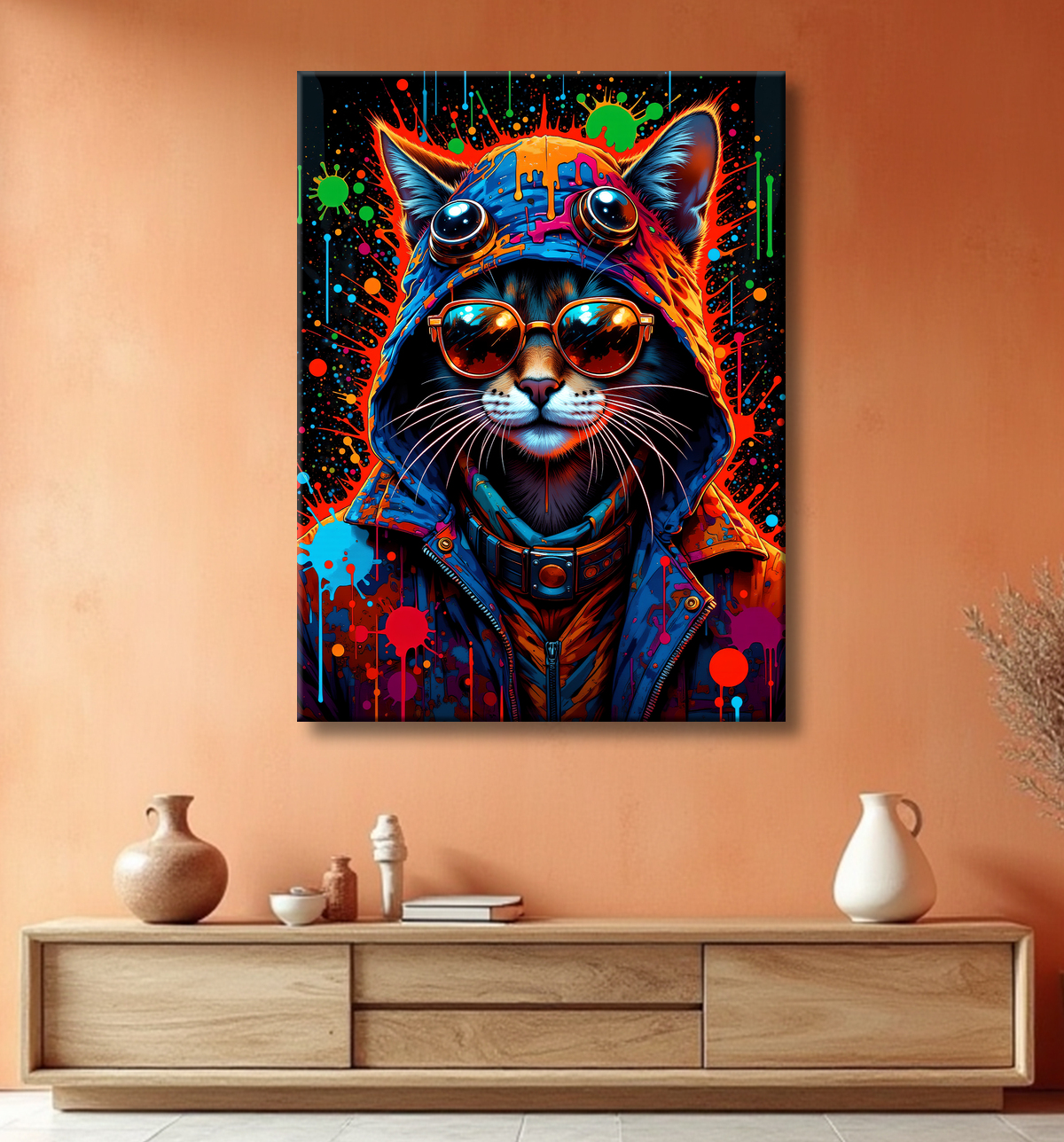 Déclinée en plusieurs modèles exclusifs, cette série propose des chats tantôt excentriques, tantôt provocateurs, toujours spectaculaires. On y trouve des influences hip-hop, electro, jazz, biker ou streetwear, le tout porté par une explosion graphique de tags, de projections de peinture, de textures urbaines brutes et de fonds électriques. Ces tableaux chat graffiti s’intègrent à merveille dans des intérieurs créatifs, des studios, des chambres d’ados, ou des espaces professionnels à forte identité visuelle. Pour une immersion totale dans ce style, découvrez également notre collection Animaux Graffitis Splash Color, où chaque œuvre est poussée à l’extrême en termes de couleurs et d’intensité visuelle.