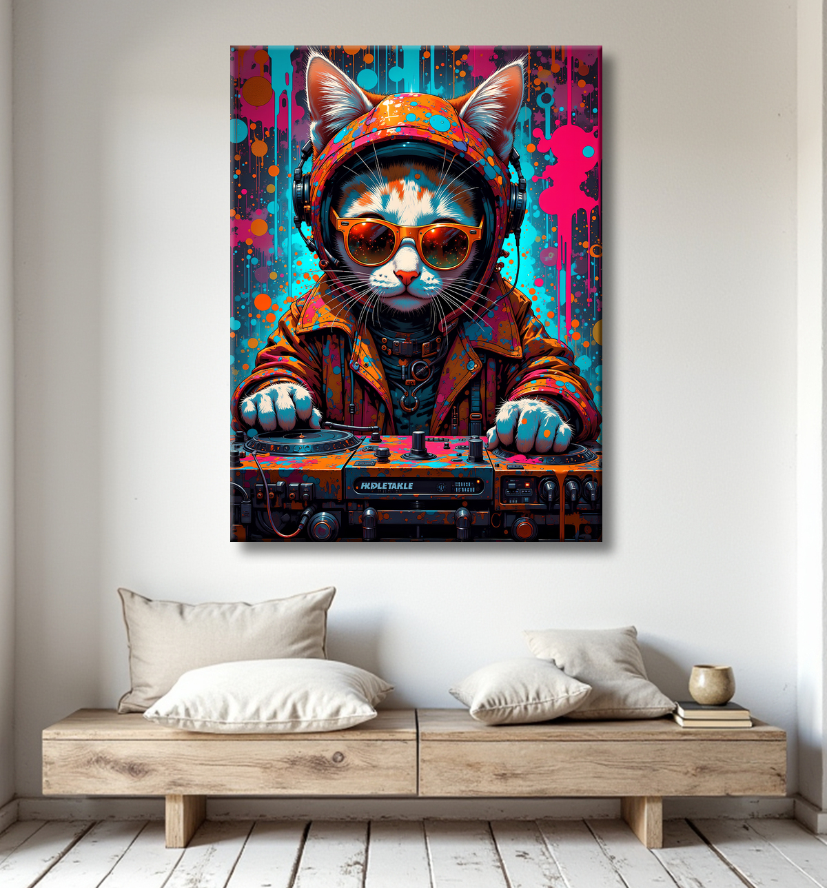 Chez Decotab, le chat graffiti se décline dans une palette visuelle puissante et radicalement urbaine. Chaque tableau met en scène le félin dans des univers où les couleurs vives — rouges éclatants, bleus électriques, jaunes acides — explosent littéralement sur la toile. Pas de place pour le minimalisme ici : chaque modèle joue la carte de l’intensité, du contraste, et de l’accumulation graphique. On retrouve des chats DJ avec casques et platines, des félins punk en blouson fluo, des clowns provocateurs ou des graffeurs stylisés. Le style est affirmé, saturé, hautement expressif — parfait pour une décoration murale qui se veut originale et percutante.