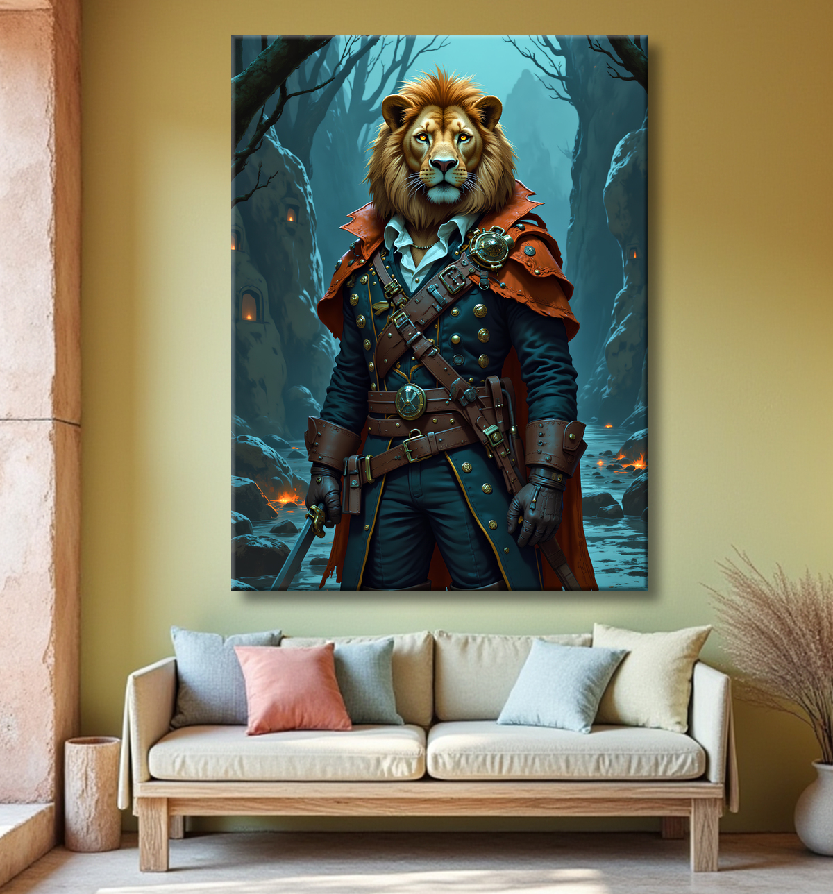 Ce tableau lion pirate s’intègre aussi bien dans une chambre à thème, un salon décalé ou un espace de travail inspirant. Sa présence décorative est forte sans être envahissante, et chaque détail — de la texture du pelage aux éclats de lumière dans l’œil du personnage — renforce la qualité artistique de l’ensemble. Que vous choisissiez une version en toile d’art tendue, encadrée ou non, ou un tirage papier avec caisse américaine, chaque tableau bénéficie d’une finition haut de gamme. Pour compléter une ambiance animalière élégante, vous pouvez également explorer nos portraits de lions en noir et blanc ou notre collection hypnotique.
