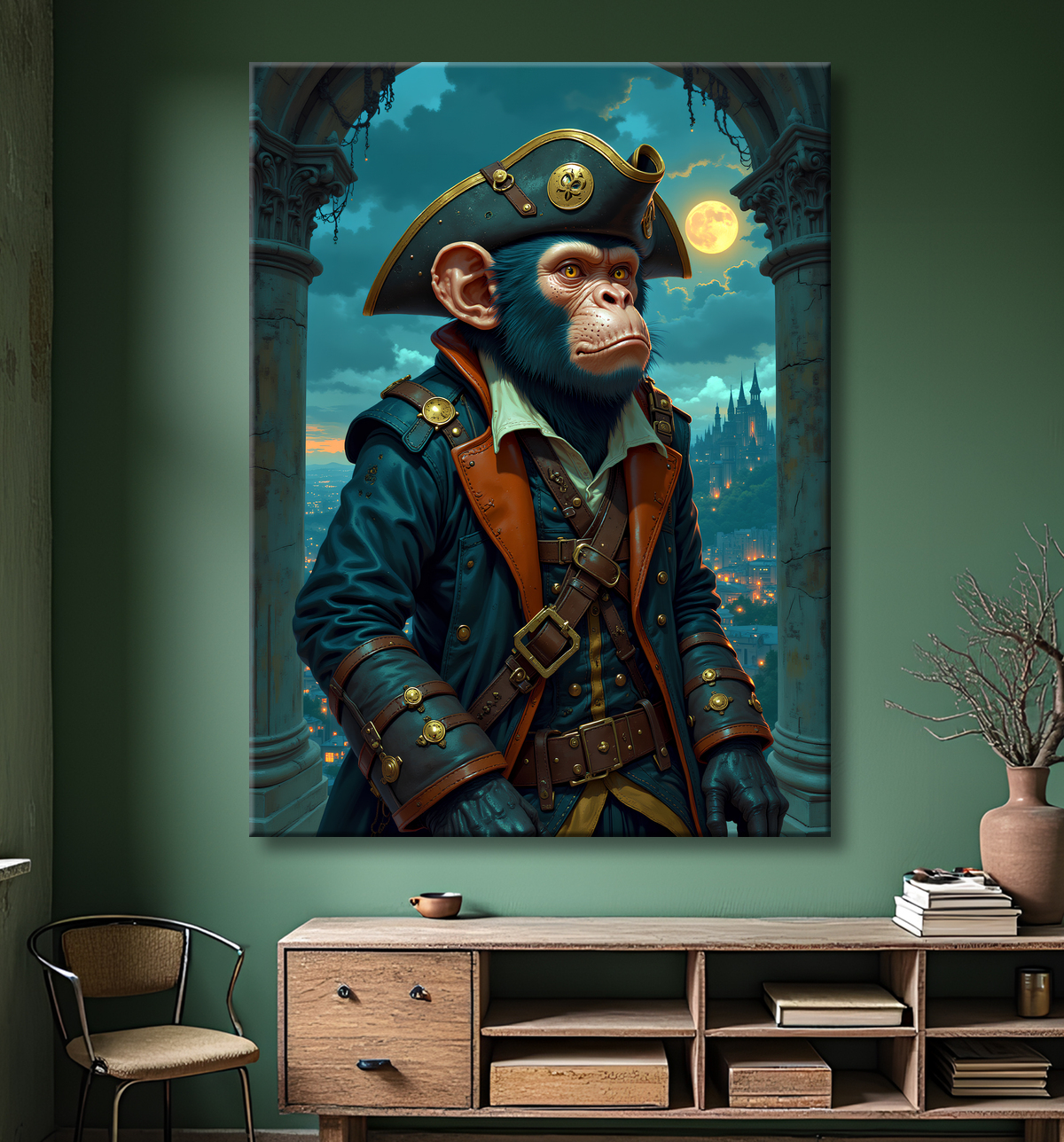 Chaque déclinaison du tableau chimpanzé pirate propose une nouvelle facette du personnage. Certains modèles le montrent dans un décor maritime tourmenté, d’autres dans une lumière dorée de coucher de soleil. Vous trouverez des costumes raffinés, avec broderies, foulards, boucles d’oreilles, mais aussi des versions plus modernes aux allures de corsaire urbain. Cette diversité permet de s’adapter à des univers décoratifs variés, qu’il s’agisse d’une salle de jeu, d’un bureau créatif ou même d’une chambre d’ado.