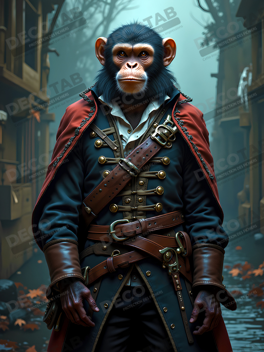 Le chimpanzé pirate de Decotab incarne à merveille l’esprit facétieux de la piraterie. Affublé d’un bandana rouge vif, d’un cache-œil en cuir ou encore d’une longue-vue en main, ce chimpanzé affiche une attitude espiègle, parfois rebelle, mais toujours attachante. Inspiré du travail de Sylvain Binet, ce tableau s’inscrit dans un style hyper réaliste avec une touche cartoon, apportant un niveau de détail exceptionnel tout en conservant un ton léger et théâtral. Plusieurs versions du personnage existent : tantôt capitaine féroce sur le pont, tantôt pirate farceur au fond d’une taverne animée.