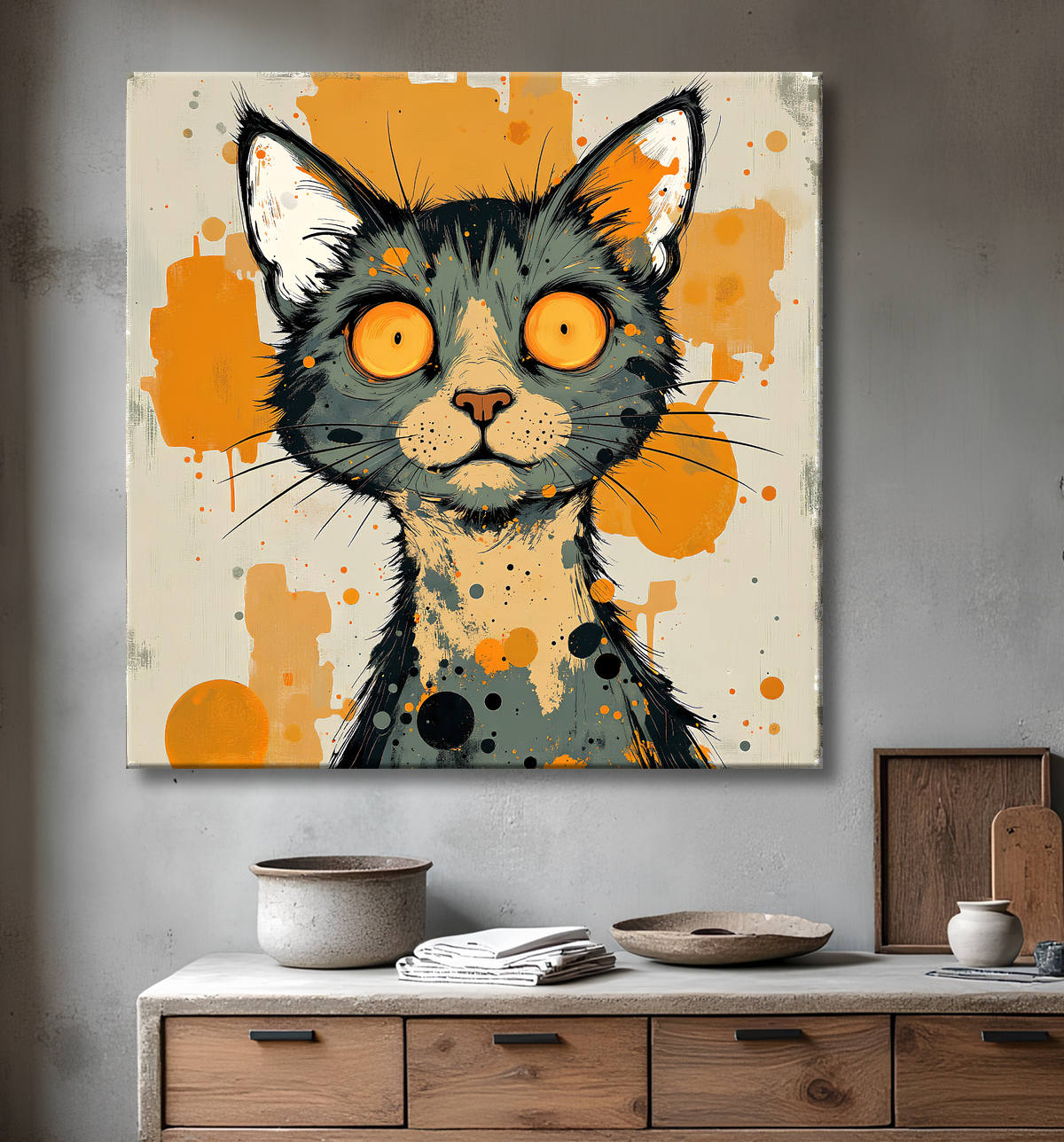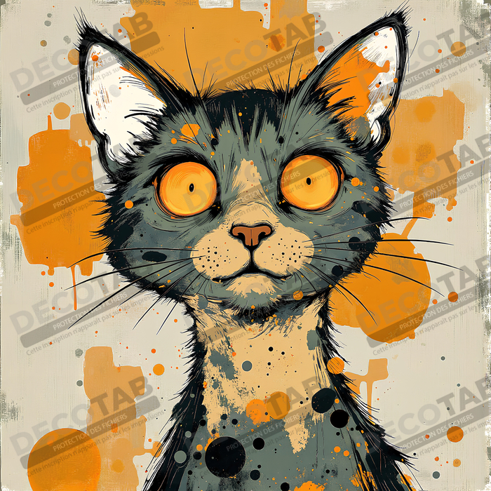 Ce tableau de chat se distingue par une technique artistique audacieuse mêlant réalisme illustratif et créativité moderne. Avec des coups de pinceaux expressifs, des effets de projections artistiques et un fond légèrement vintage, cette œuvre est idéale pour apporter une touche unique et contemporaine à votre décoration.