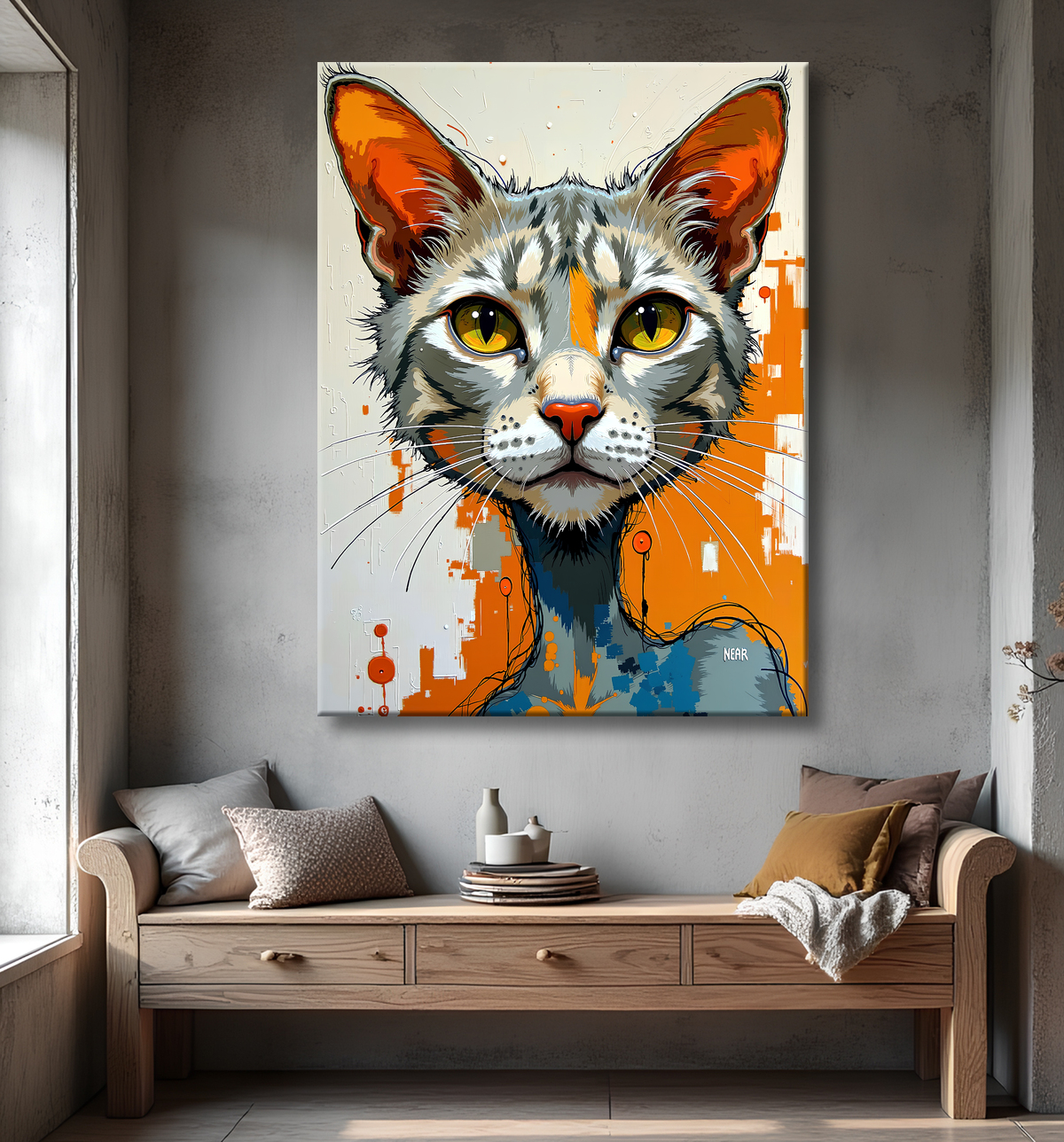 Ce tableau de chat se distingue par une technique artistique audacieuse mêlant réalisme illustratif et créativité moderne. Avec des coups de pinceaux expressifs, des effets de projections artistiques et un fond légèrement vintage, cette œuvre est idéale pour apporter une touche unique et contemporaine à votre décoration.