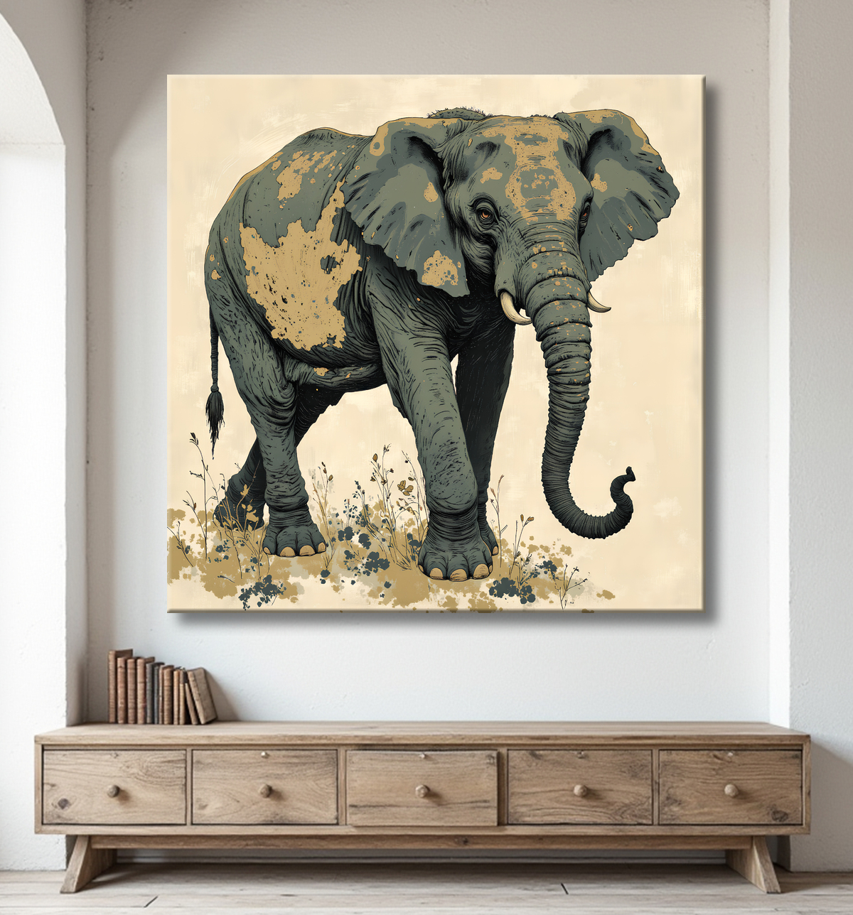 Réalisé avec des techniques picturales modernes, ce tableau éléphant se distingue par ses traits énergiques, ses projections artistiques dynamiques et un fond décoratif aux accents vintage. Cette approche artistique contemporaine rend chaque tableau unique, apportant ainsi une touche remarquable et audacieuse à votre décoration.