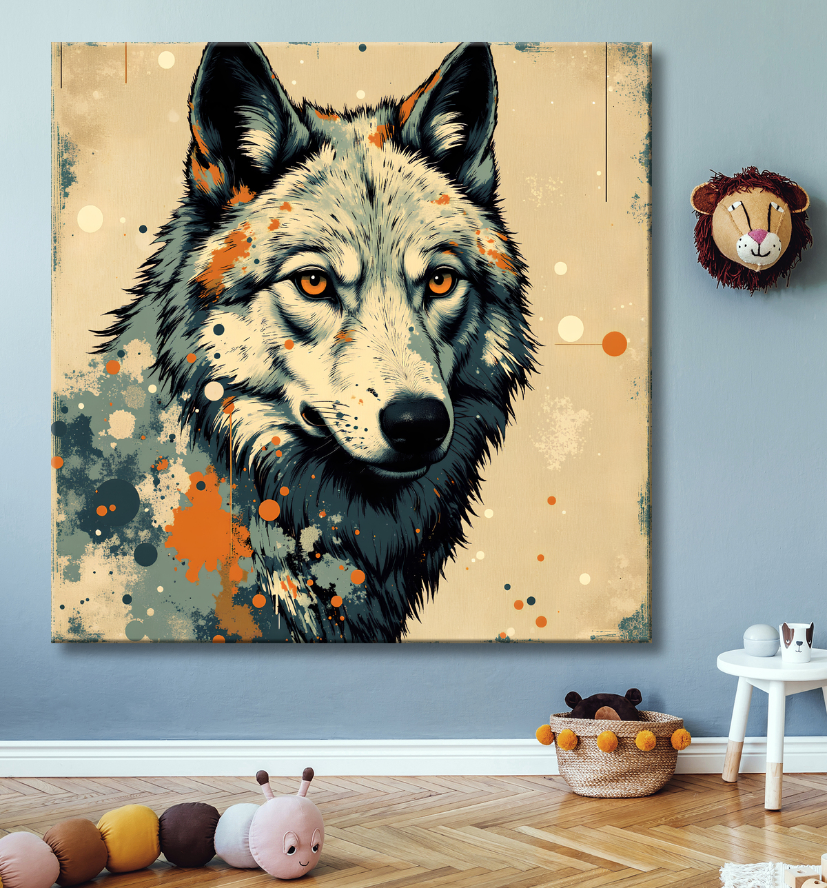 Ce tableau loup se distingue par un style artistique affirmé, mêlant illustration réaliste et peinture contemporaine expressive. Le rendu visuel dynamique est accentué par des touches de peinture apparentes, des projections audacieuses et un fond décoratif subtilement vintage. Cette esthétique originale apporte intensité et modernité à votre espace.