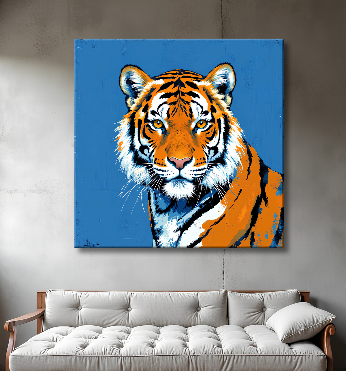 Les teintes dominantes varient entre des bruns profonds, des gris bleutés, des touches d'ocre et parfois quelques éclats de couleurs plus vives, toujours utilisées avec subtilité. Ce choix chromatique apporte au tableau une élégance intemporelle, tout en mettant en valeur la puissance tranquille du sujet. Certaines versions intègrent des éléments géométriques ou floraux discrets, ajoutant une dimension presque vintage à l’ensemble. Ce tableau de tigre trouve naturellement sa place dans un salon moderne, un bureau design ou même une chambre au style épuré, en apportant profondeur, énergie et sophistication.