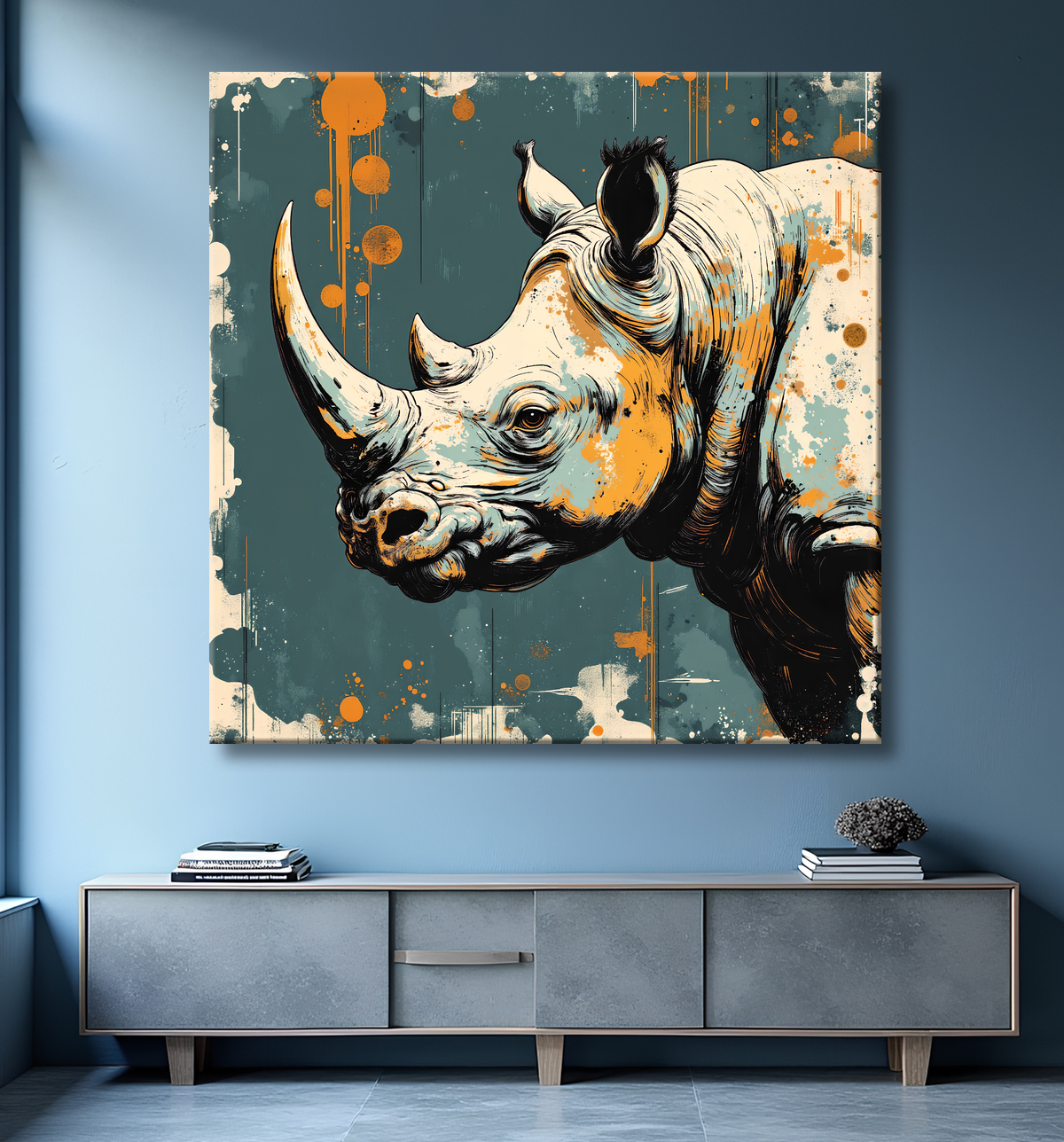Symbole de force et de détermination, le rhinocéros incarne une présence saisissante lorsqu'il est représenté en décoration intérieure. Ce tableau rhinocéros, par son style moderne et expressif, capte immédiatement le regard. À mi-chemin entre illustration réaliste et peinture contemporaine, l'œuvre traduit fidèlement l'énergie brute et la majesté tranquille de cet animal emblématique.