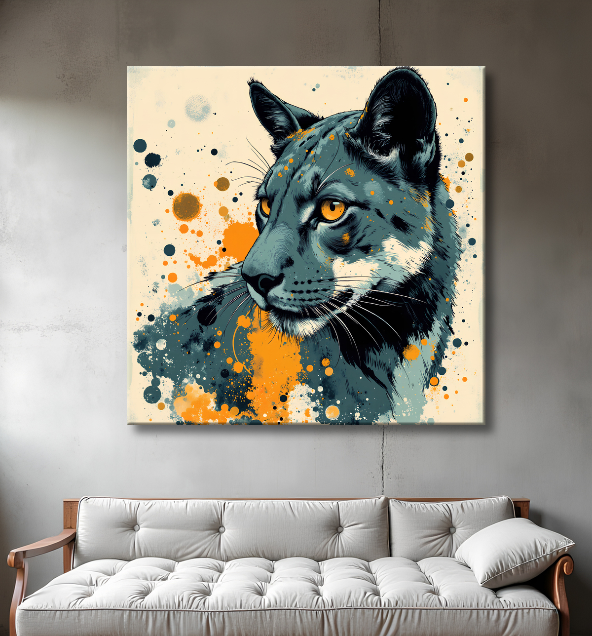 Avec ce tableau jaguar moderne, DECOTAB capture toute la majesté de l’un des félins les plus emblématiques d’Amérique latine. L’œuvre se distingue par une alliance habile entre coups de pinceaux énergiques, esquisses fines et textures marquées, offrant une interprétation vibrante du regard intense et de la musculature souple du jaguar. Plusieurs versions sont proposées : des portraits serrés où l’intensité du regard fascine, à des silhouettes élégantes surgissant de fonds travaillés aux teintes sobres — gris minéral, bleu profond, beige patiné. Ce style unique combine modernité et raffinement, avec parfois l'ajout subtil de motifs graphiques ou floraux pour enrichir la composition. Pour découvrir d'autres approches félines dans cet esprit graphique, explorez aussi notre collection de félins modernes.