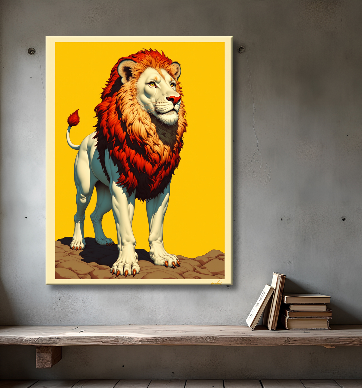 Ce tableau présente un lion illustré de manière réaliste, avec un pelage d'un blanc éclatant et une crinière orangée évoquant des flammes. Cette combinaison de couleurs inhabituelle crée un contraste saisissant, renforcé par le fond jaune vif et uni. Le réalisme de l'illustration, allié à ces teintes singulières, donne à l'œuvre une présence à la fois majestueuse et mystérieuse. Ce lion, à la fois familier et fantastique, semble presque sortir d'un rêve.