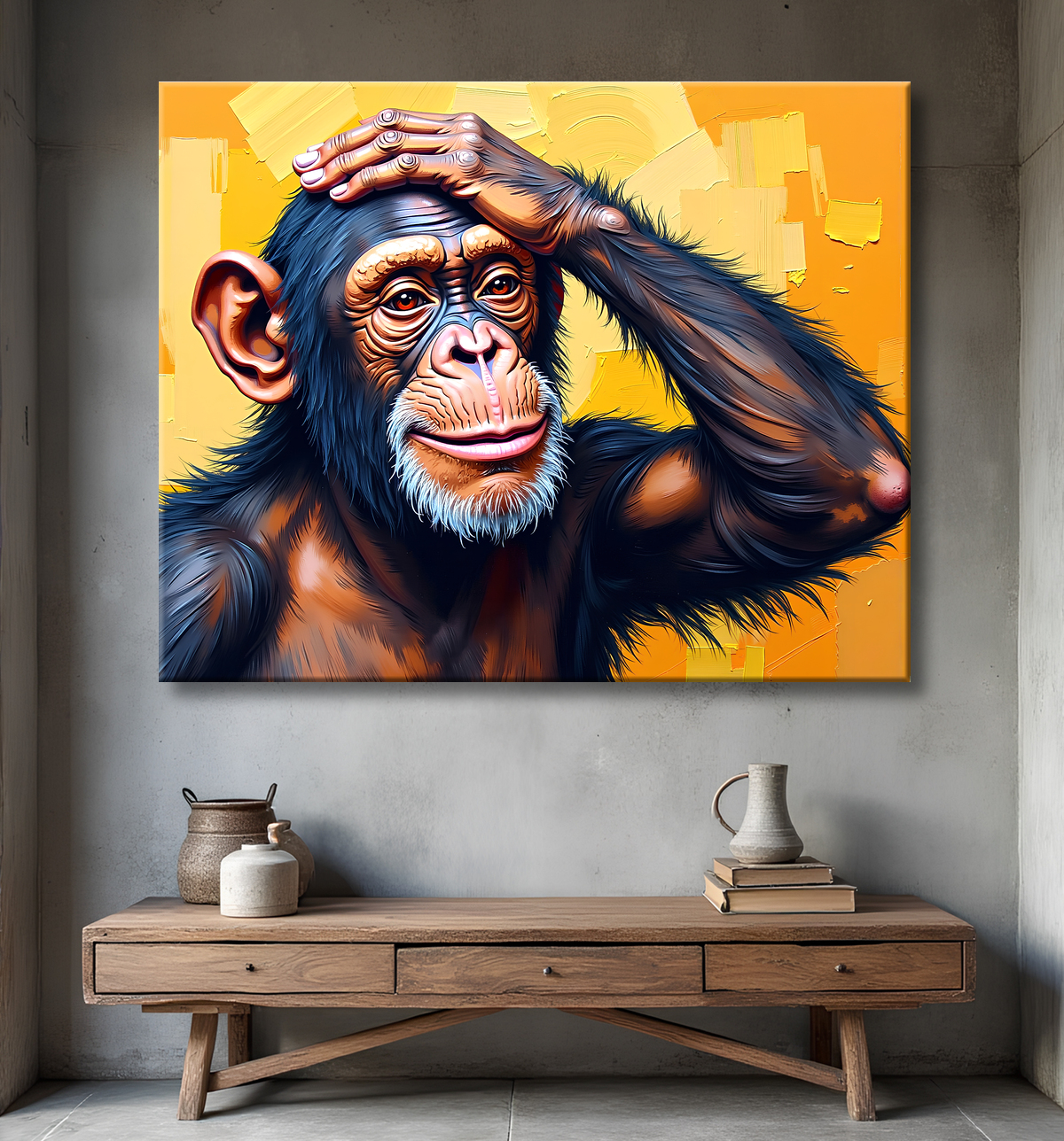 Ce tableau présente un chimpanzé pensif à l’expression amusée et intriguée, contrastant fortement avec un arrière-plan jaune-orangée très vif, imitant une peinture texturée au couteau. Bien qu’il s’agisse d’un tirage d'art en impression numérique, la reproduction fidèle de la matière apporte relief et dynamisme à l’œuvre. Ce contraste original entre la finesse de l’illustration du singe et l’épaisseur simulée du fond offre une touche décorative unique et pleine de caractère.