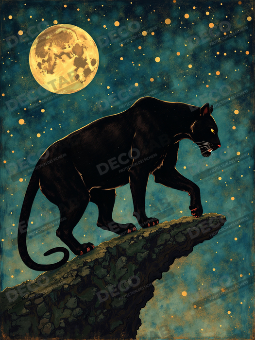 Chaque tableau de panthère noire est disponible en plusieurs formats — carré, vertical, panoramique — pour s'adapter à toutes les configurations d’espace. Imprimé à la demande dans nos ateliers français, il est proposé sur toile tendue, papier d’art premium ou support rigide haut de gamme. Grâce à l’outil de recadrage DECOTAB, vous pouvez ajuster parfaitement la composition selon votre espace mural. Pour intensifier encore la profondeur du ciel étoilé et des reflets lunaires, une option de vernis satiné est disponible.