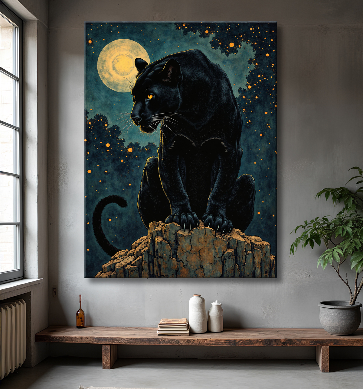 Ce tableau panthère noire féerique capture toute l'élégance silencieuse et la puissance discrète de l'animal mythique, baigné par la lumière argentée d'une pleine lune majestueuse. Dans un ciel saturé d'étoiles et de brumes vaporeuses, la silhouette de la panthère noire se dessine avec grâce et mystère. Les nuances de bleu nuit, d'argent éclatant et de reflets violet profond viennent souligner la noblesse naturelle de cet animal fascinant. Chaque version du tableau révèle une panthère presque surnaturelle, comme issue d'un rêve où la frontière entre la réalité et la magie se brouille, offrant ainsi une œuvre hypnotique et hautement symbolique.