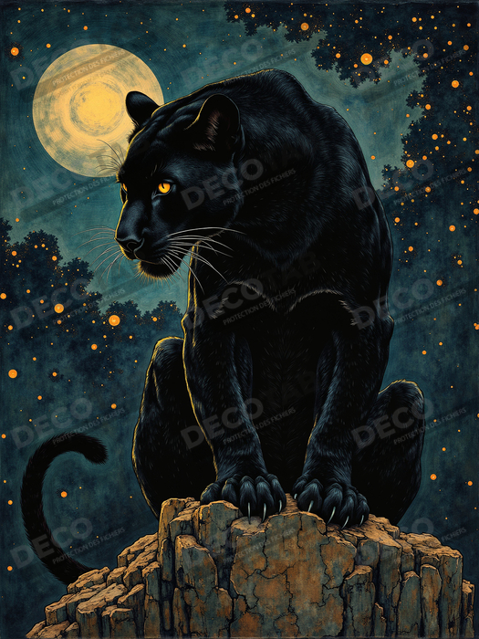 Chaque tableau de panthère noire est disponible en plusieurs formats — carré, vertical, panoramique — pour s'adapter à toutes les configurations d’espace. Imprimé à la demande dans nos ateliers français, il est proposé sur toile tendue, papier d’art premium ou support rigide haut de gamme. Grâce à l’outil de recadrage DECOTAB, vous pouvez ajuster parfaitement la composition selon votre espace mural. Pour intensifier encore la profondeur du ciel étoilé et des reflets lunaires, une option de vernis satiné est disponible.