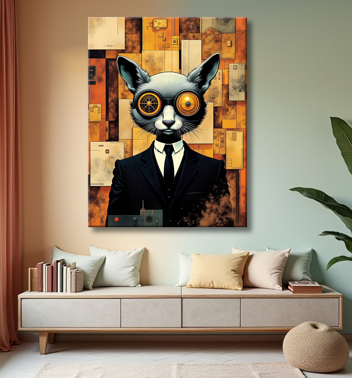 La construction visuelle de cette œuvre repose sur un équilibre raffiné entre les formes et les couleurs. Les teintes dominantes — jaunes ocre, bruns profonds, noirs veloutés — instaurent une atmosphère chaleureuse, enveloppante, presque cinématographique. Le fond sombre et l’éclairage étudié font ressortir les textures, le grain des fourrures et la singularité de chaque espèce. Le rendu final est à la fois moderne et intemporel, parfait pour donner du caractère à un intérieur sobre ou à une décoration plus audacieuse.