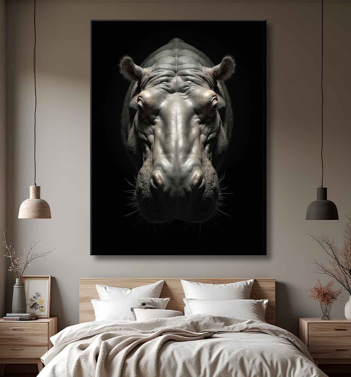 Ce tableau d’hippopotame sur fond noir propose une relecture élégante et artistique de cet animal emblématique des rivières africaines. Loin des clichés humoristiques ou caricaturaux, le traitement studio met en lumière la force tranquille de ce colosse. Sa peau texturée, ses plis puissants, son regard calme prennent une dimension presque sculpturale sous un éclairage doux et maîtrisé. L’absence de décor superflu permet de se concentrer sur l’essentiel, révélant une prestance souvent insoupçonnée. L’œuvre, à la fois sobre et étonnante, attire l’œil et suscite la curiosité sans en faire trop.