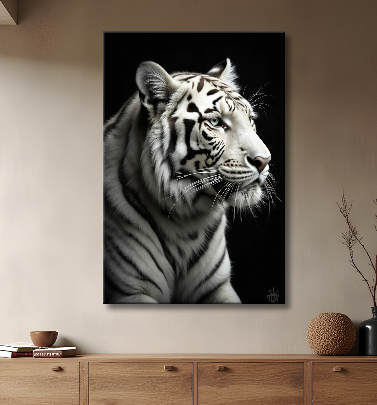 Ce tableau de tigre blanc sur fond noir capture toute la puissance et la grâce de cet animal exceptionnel. Le style studio met en lumière la texture de sa fourrure et l’intensité de son regard, grâce à un éclairage ciblé qui joue avec les ombres. La palette est en couleur mais se rapproche du noir et blanc, renforçant la sobriété et le raffinement de la composition. Les clients peuvent, s’ils le souhaitent, choisir une version en noir et blanc pur via l’outil de personnalisation. Le rendu global est d’une grande élégance, idéal pour une pièce à la décoration soignée et contemporaine.