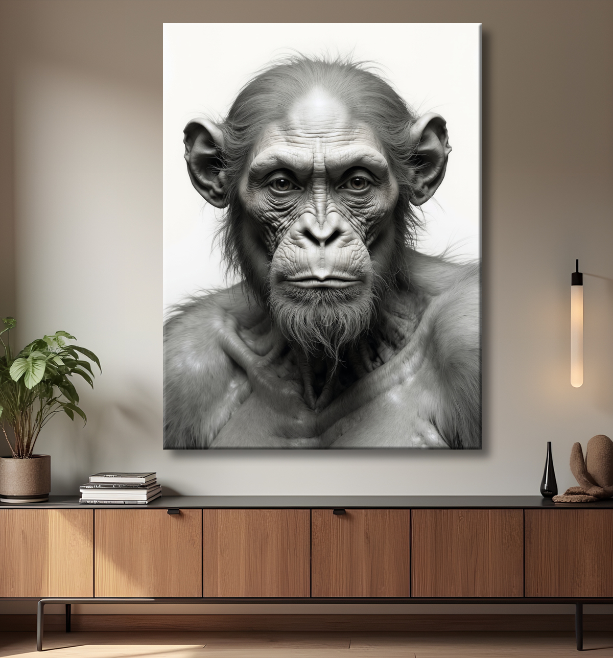 Ce tableau met en scène un chimpanzé photographié avec une finesse remarquable, sur fond blanc pur ou légèrement texturé. Chaque version explore une expression différente : curieuse, malicieuse, méditative… Ce jeu de variations rend l'œuvre profondément vivante. La sobriété du décor concentre l'attention sur les traits du singe, sa texture, son regard. Cette approche photographique en studio permet de créer un impact visuel fort tout en s'intégrant harmonieusement dans les espaces modernes. Ce portrait séduit autant pour son humour discret que pour sa puissance expressive, apportant une note de caractère tout en restant dans une ligne esthétique épurée.