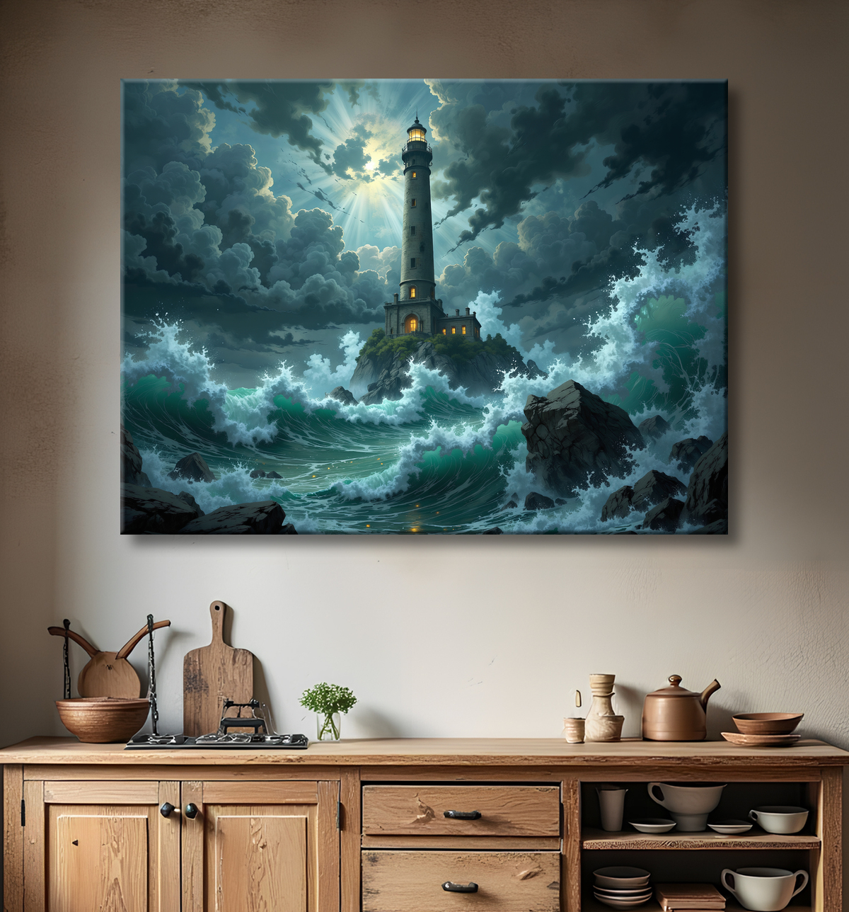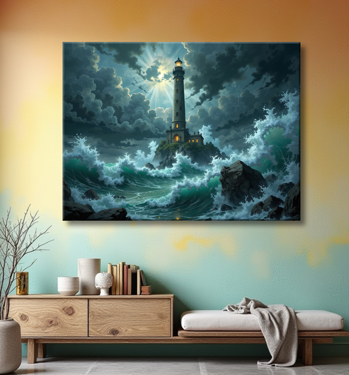 Tableau d'un phare maritime au cœur d'une tempête fantastique : une illustration puissante et captivante