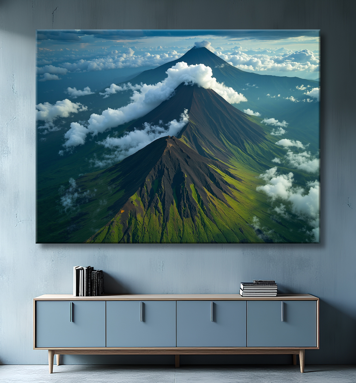 Ce tableau capture toute la puissance et l'intensité d'un paysage volcanique remarquable. Les couleurs profondes et les contrastes forts apportent un caractère visuel unique et saisissant à cette œuvre, disponible aussi bien en photographie réaliste qu'en illustration artistique. Elle exprime avec force la beauté mystérieuse et la grandeur naturelle des volcans.