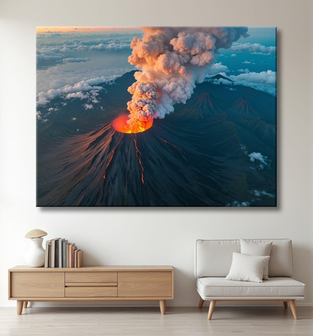 Ce tableau capture toute la puissance et l'intensité d'un paysage volcanique remarquable. Les couleurs profondes et les contrastes forts apportent un caractère visuel unique et saisissant à cette œuvre, disponible aussi bien en photographie réaliste qu'en illustration artistique. Elle exprime avec force la beauté mystérieuse et la grandeur naturelle des volcans.