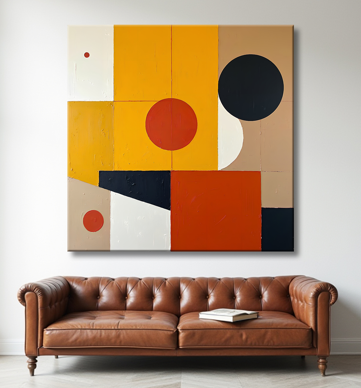 Par sa simplicité géométrique et sa palette chaude mais neutre, ce tableau s’intègre facilement dans des environnements naturels, minimalistes ou contemporains. Il apporte une sensation de stabilité visuelle et de confort discret, tout en affirmant un goût pour l’épure et la composition soignée.