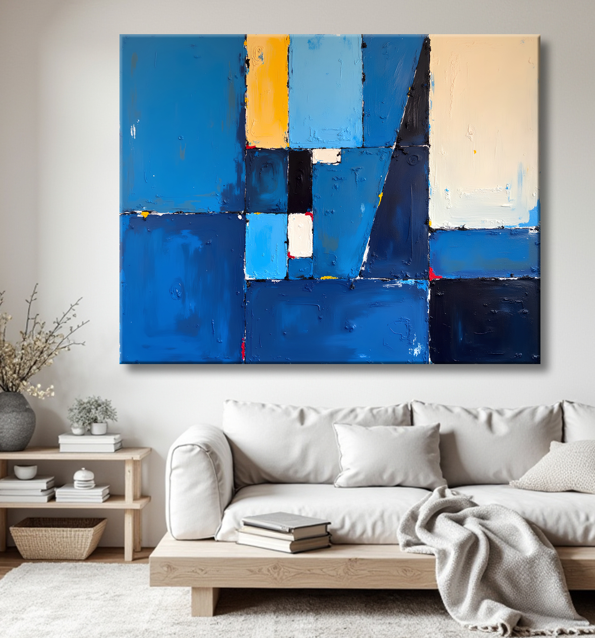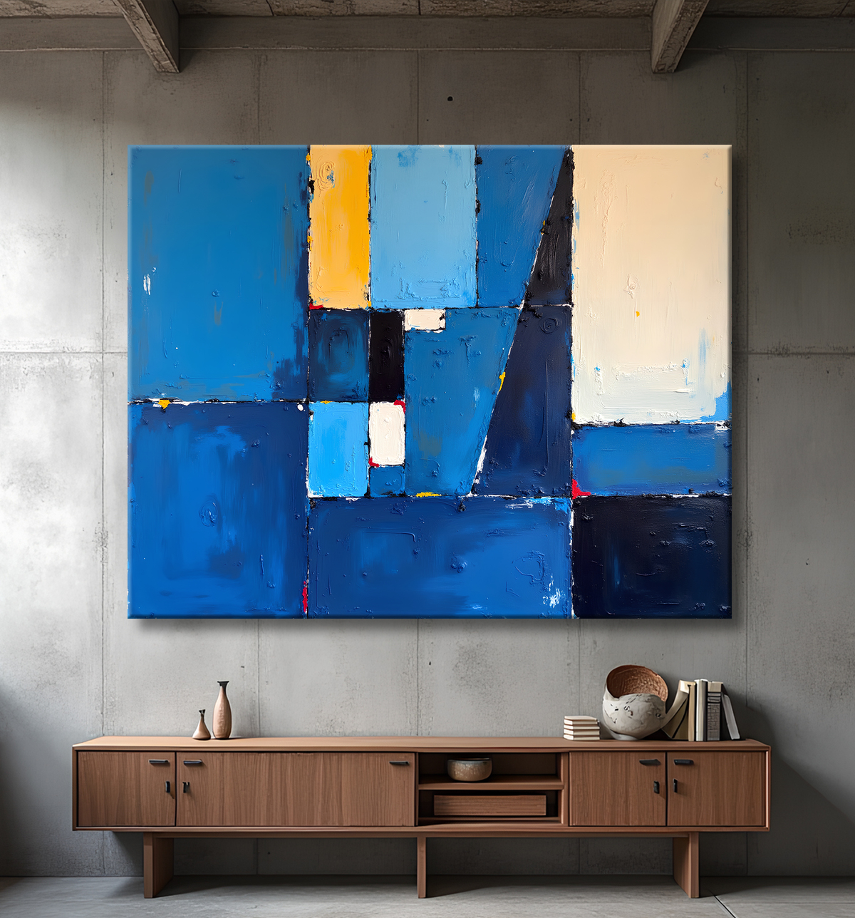Ce type de tableau abstrait trouve sa place dans des environnements modernes, minimalistes ou design. Sa sobriété formelle et la profondeur de ses bleus lui permettent d’habiller un mur sans surcharge visuelle, tout en apportant une touche d’élégance structurée. Idéal pour un salon épuré, un bureau ou une pièce de passage à l’ambiance feutrée.