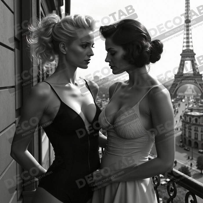 Ce tableau en noir et blanc dévoile une scène sobre et pleine de douceur mettant en avant deux femmes en couple, contemplant la ville depuis un balcon parisien typique. La complicité discrète, subtilement suggérée par leur posture, s’allie harmonieusement à l’élégance naturelle de la capitale : façades haussmanniennes, toits de Paris et silhouette de la tour Eiffel en arrière-plan.