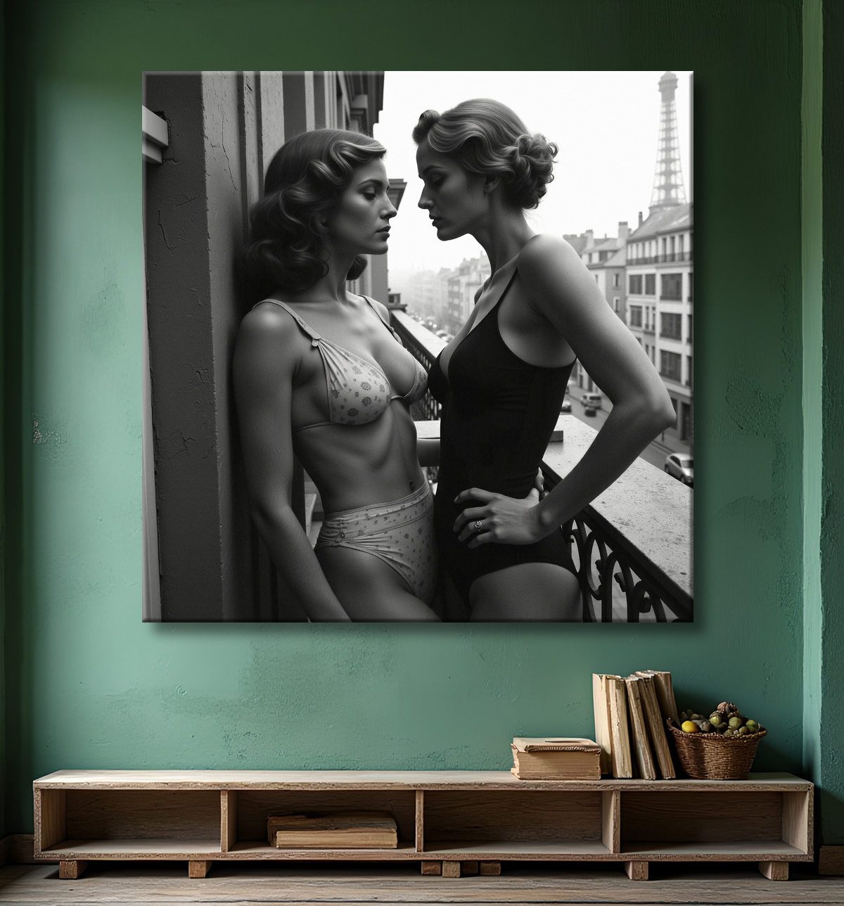 Ce tableau en noir et blanc dévoile une scène sobre et pleine de douceur mettant en avant deux femmes en couple, contemplant la ville depuis un balcon parisien typique. La complicité discrète, subtilement suggérée par leur posture, s’allie harmonieusement à l’élégance naturelle de la capitale : façades haussmanniennes, toits de Paris et silhouette de la tour Eiffel en arrière-plan.