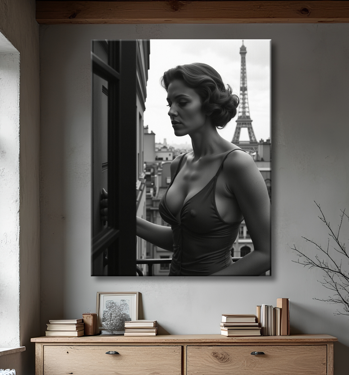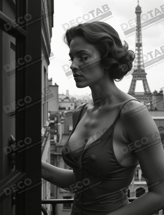 Cette œuvre en noir et blanc capture un moment de simplicité contemplative : une femme en sous-vêtement, de dos, se tient face à la ville depuis un balcon parisien. Le regard tourné vers l’horizon, elle domine les toits, les rues calmes, et laisse entrevoir au loin la silhouette de la tour Eiffel. La scène se veut naturelle, captée dans un instant d’intimité, à l’abri du tumulte de la ville.