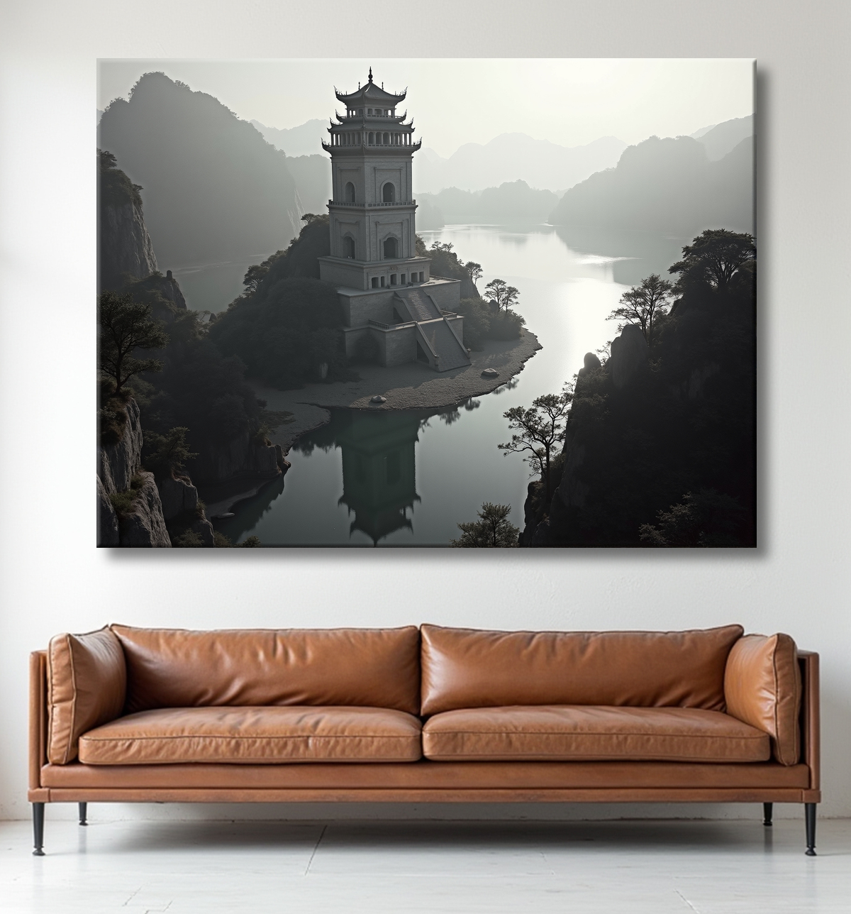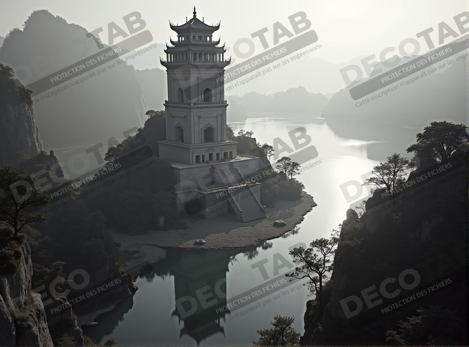Ce tableau en noir et blanc capture l'essence d'un paysage asiatique mystérieux et apaisant. Une pagode majestueuse se dresse sur les rives d'un lac calme, entourée de montagnes imposantes et silencieuses. Le lieu, désert et énigmatique, dégage une atmosphère de sérénité et de recueillement. L'absence de couleur renforce la pureté et la profondeur de la scène, invitant à la contemplation et à la méditation.